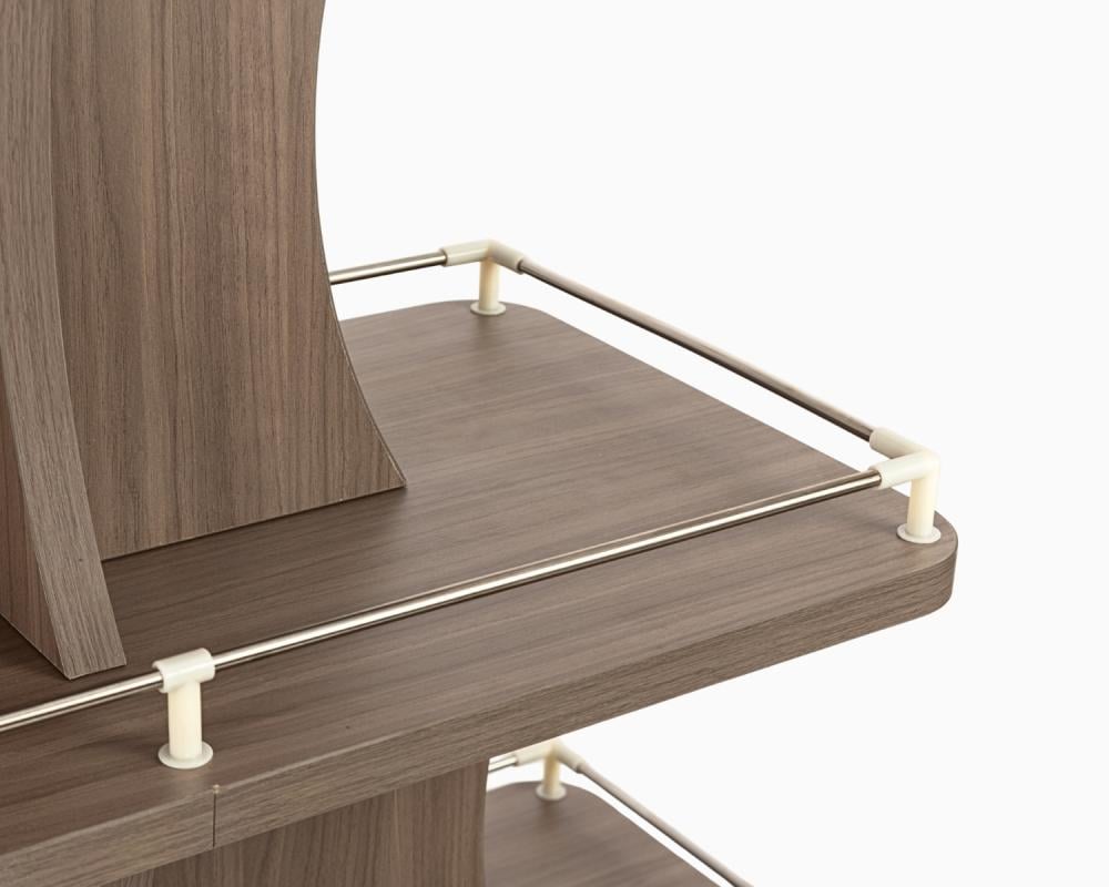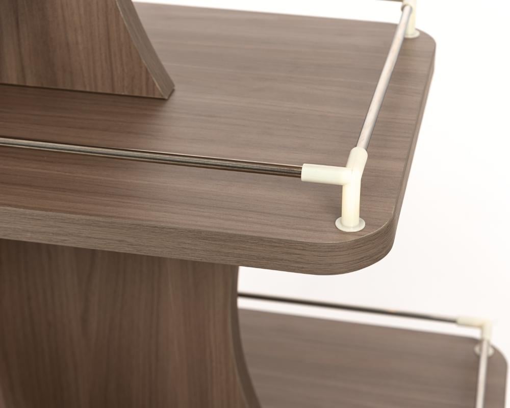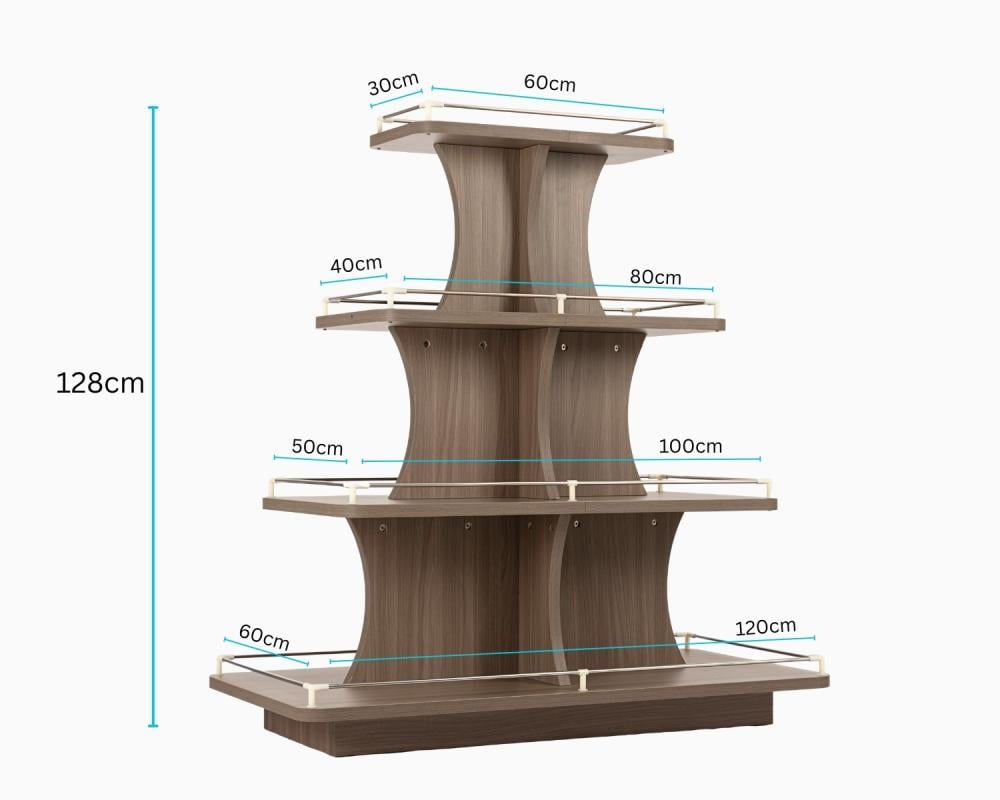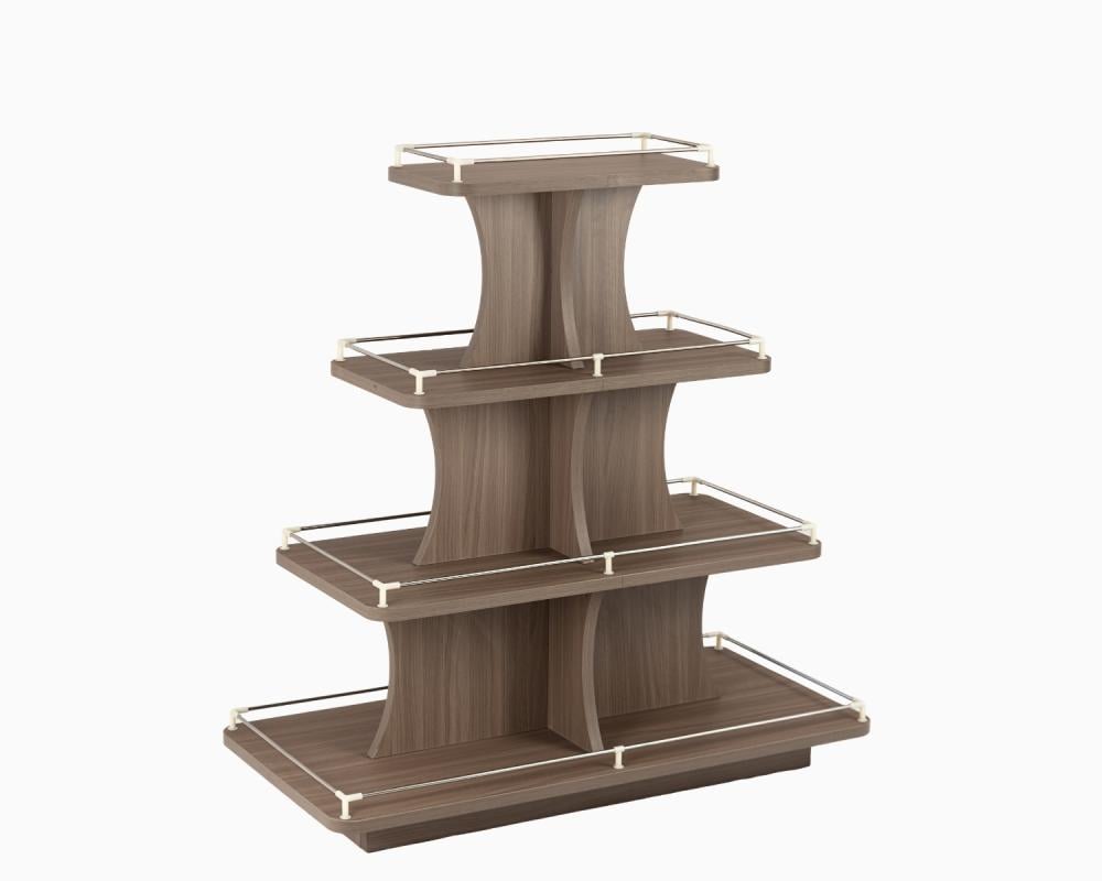 طاولة عرض منتجات خشبية أنيقة، مصممة بأربعة مستويات متدرجة لتوفير عرض عملي وجذاب للمنتجات و تتميز بمتانة عالية وشكل عصري يناسب المحلات التجارية، السوبرماركت، والمعارض