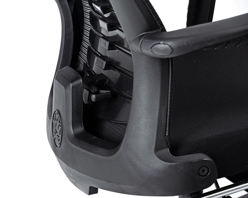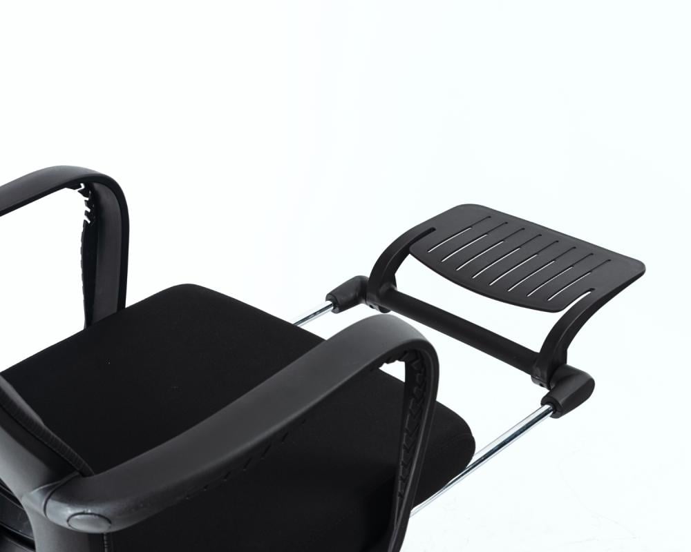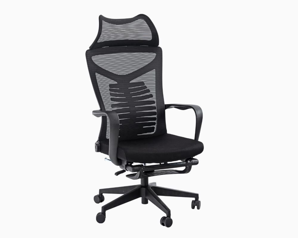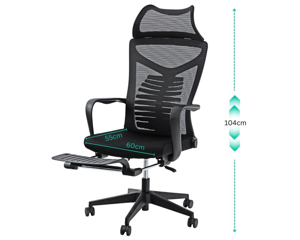 كرسي مكتبي مريح وعصري مزود بمسند للقدمين يمكن تعديله ليصبح كرسي استرخاء بزاوية تصل إلى 160 درجة يتميز بتصميم شبكي للظهر مع دعم قطني مدمج يعزز الراحة أثناء الجلوس لفترات طويلة