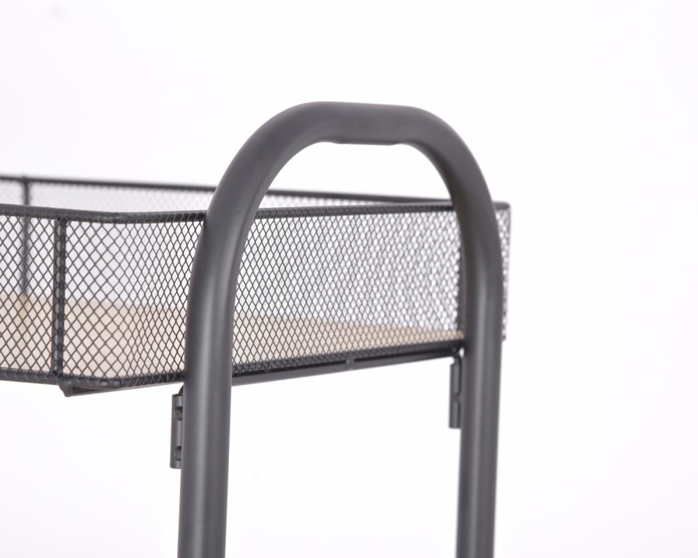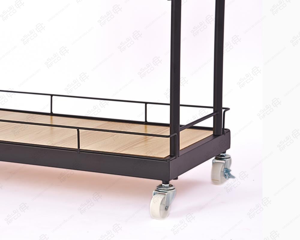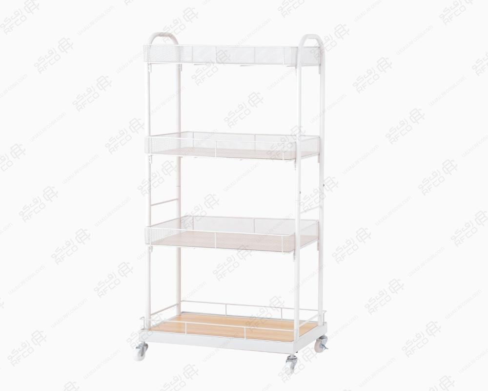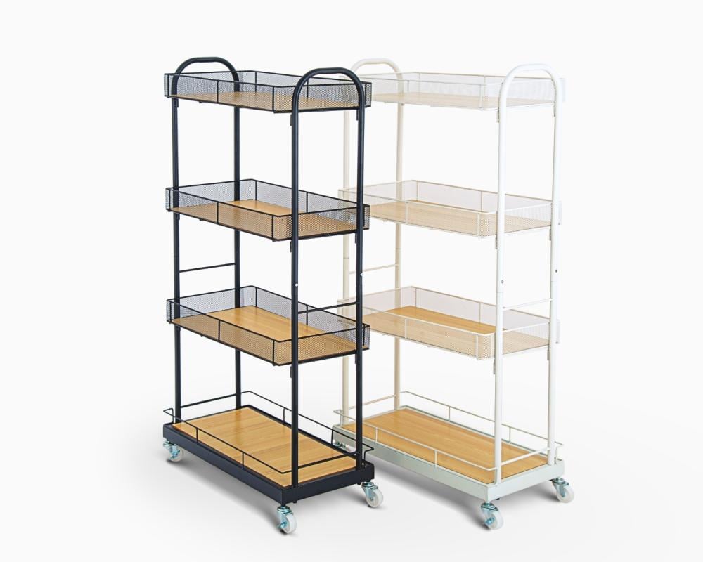 استاند عملي متعدد الاستخدامات مكون من 4 رفوف مزودة بإطار شبكي لحفظ المنتجات بأمان تصميم عصري مناسب للمعارض المتاجر والمنازل مع عجلات لسهولة الحركة.