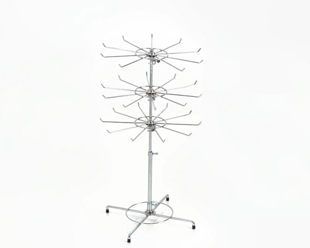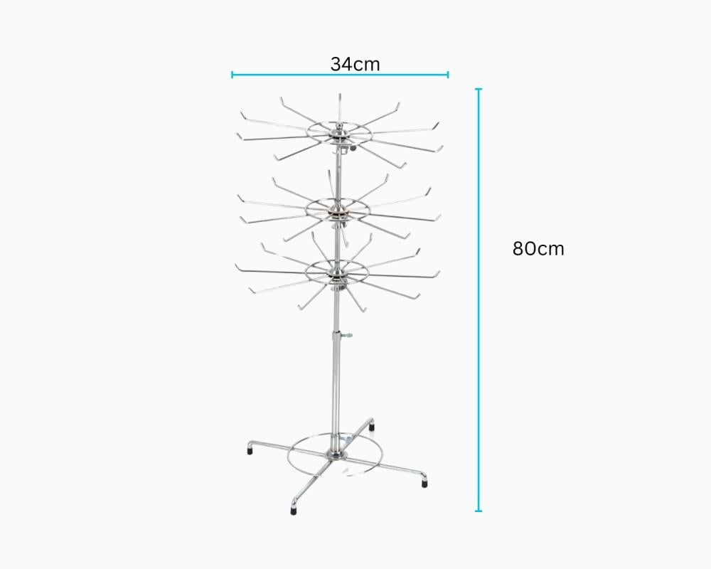 ستاند عرض دوار معدني عالي الجودة بأبعاد 80×34 سم، مصنوع في تايوان يتميز بتصميم عملي وأنيق مع 3 مستويات دوارة، يوفر مساحة مثالية لعرض الإكسسوارات، الحقائب الصغيرة، الأدوات، أو المنتجات الخفيفة بشكل منظم وملفت للنظر