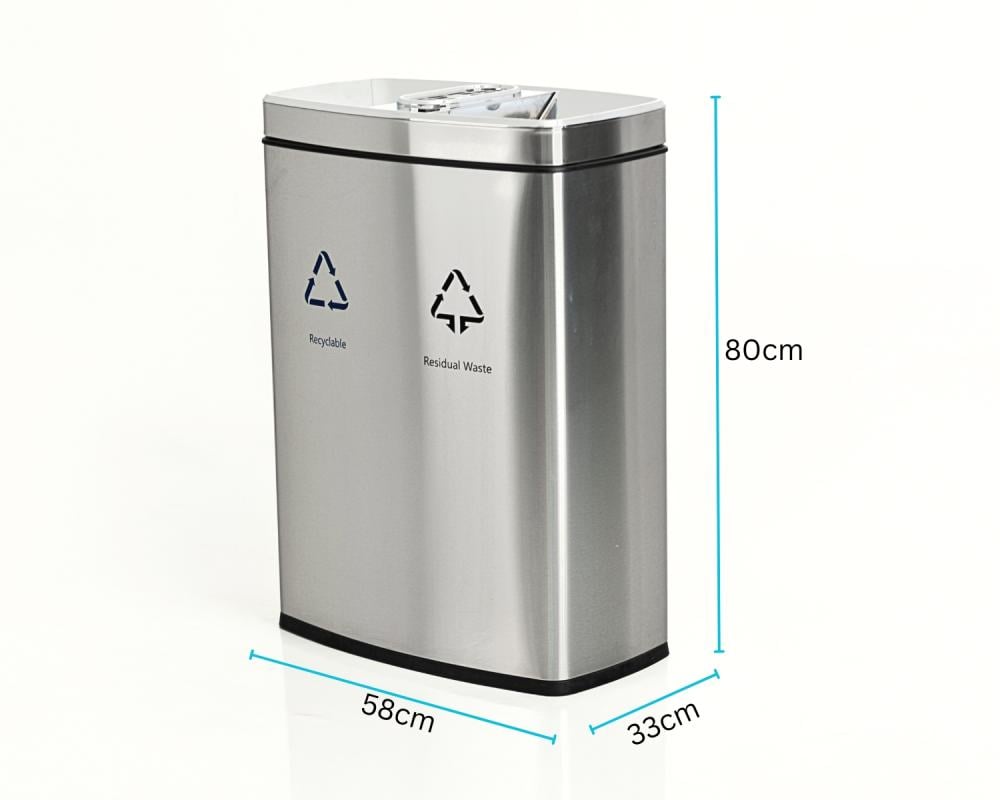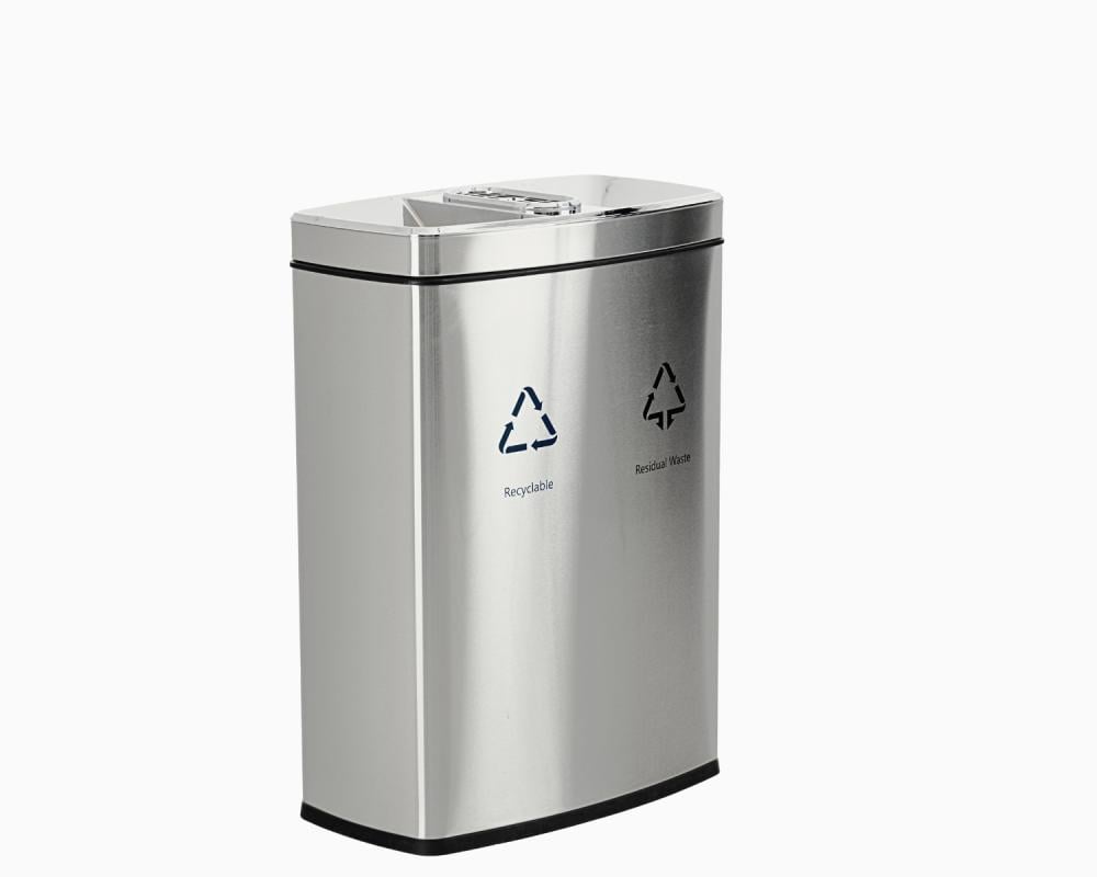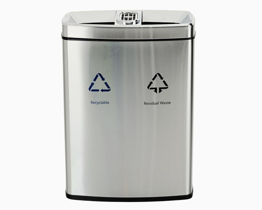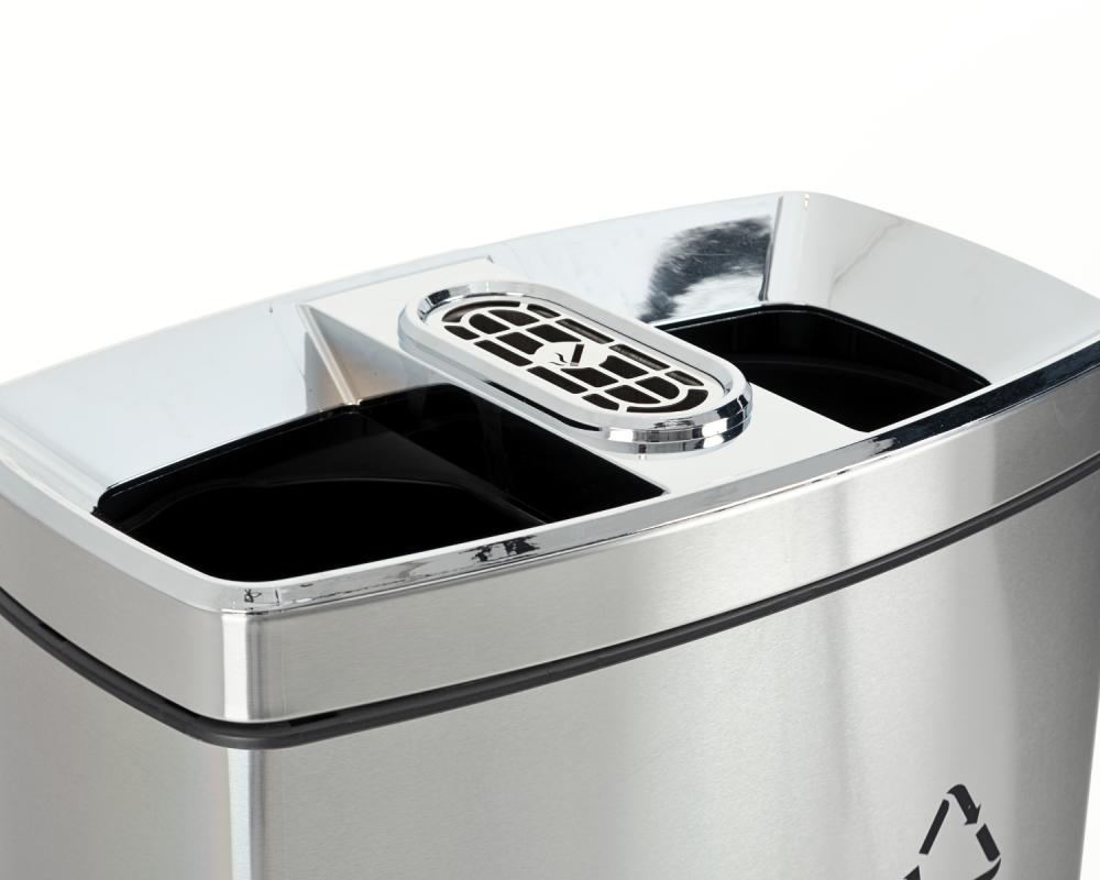 سلة نفايات مزدوجة بتصميم عملي وعصري مصنوعة من الستانلس ستيل المقاوم للصدأ تحتوي على فتحتين مخصصتين لفصل النفايات القابلة لإعادة التدوير عن النفايات المتبقية