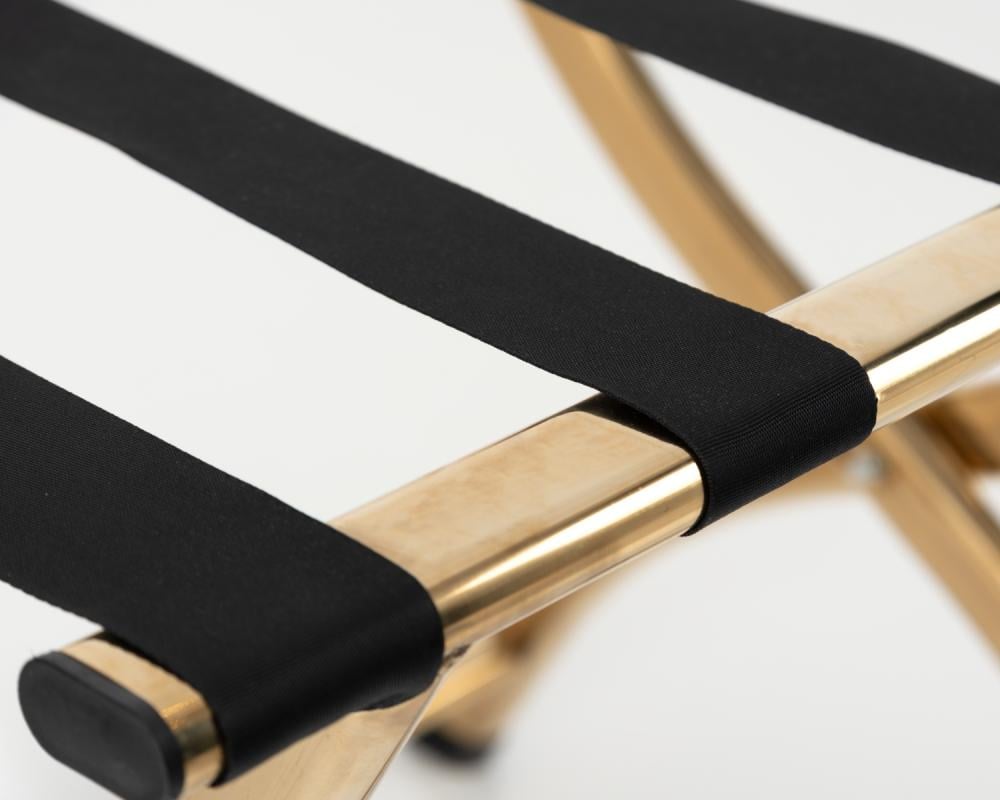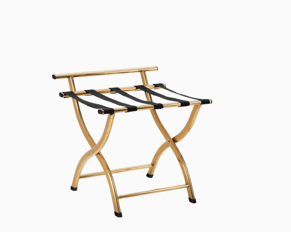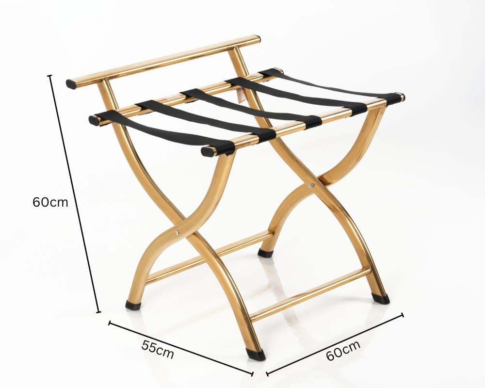 ستاند شنط فندقي عالي الجودة مثالي للاستخدام في الفنادق الشقق الفندقية، غرف الضيوف، والمنتجعات مصنوع من فولاذ مقاوم للصدأ مع لمسة جمالية باللون الذهبي