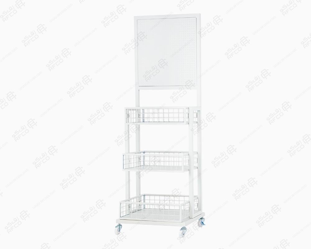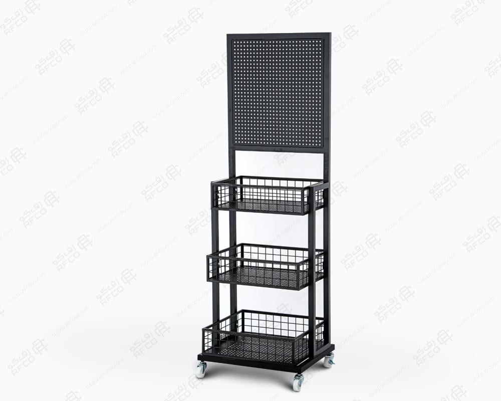 استاند عرض تجاري بتصميم مدرج من 3 رفوف معدنية وحواجز معدنية لكل رف لضمان ثبات المعروضات مزود بلوح مخرم علوي لتثبيت البطاقات أو الإكسسوارات الدعائية
