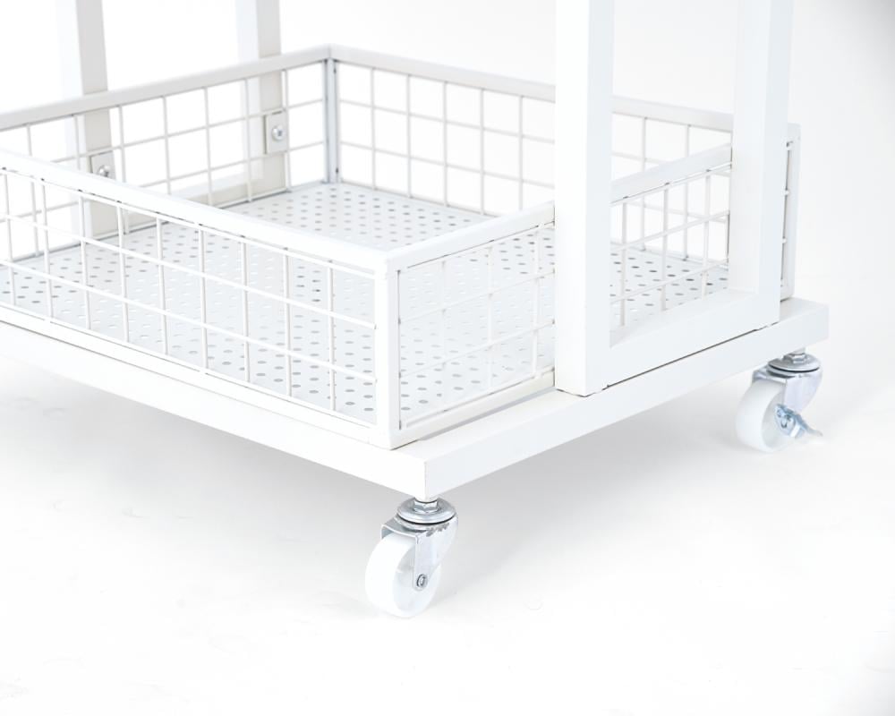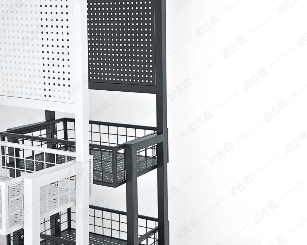 - الخامة: هيكل معدني كامل مع أرفف مخرمة وحواجز أمامية