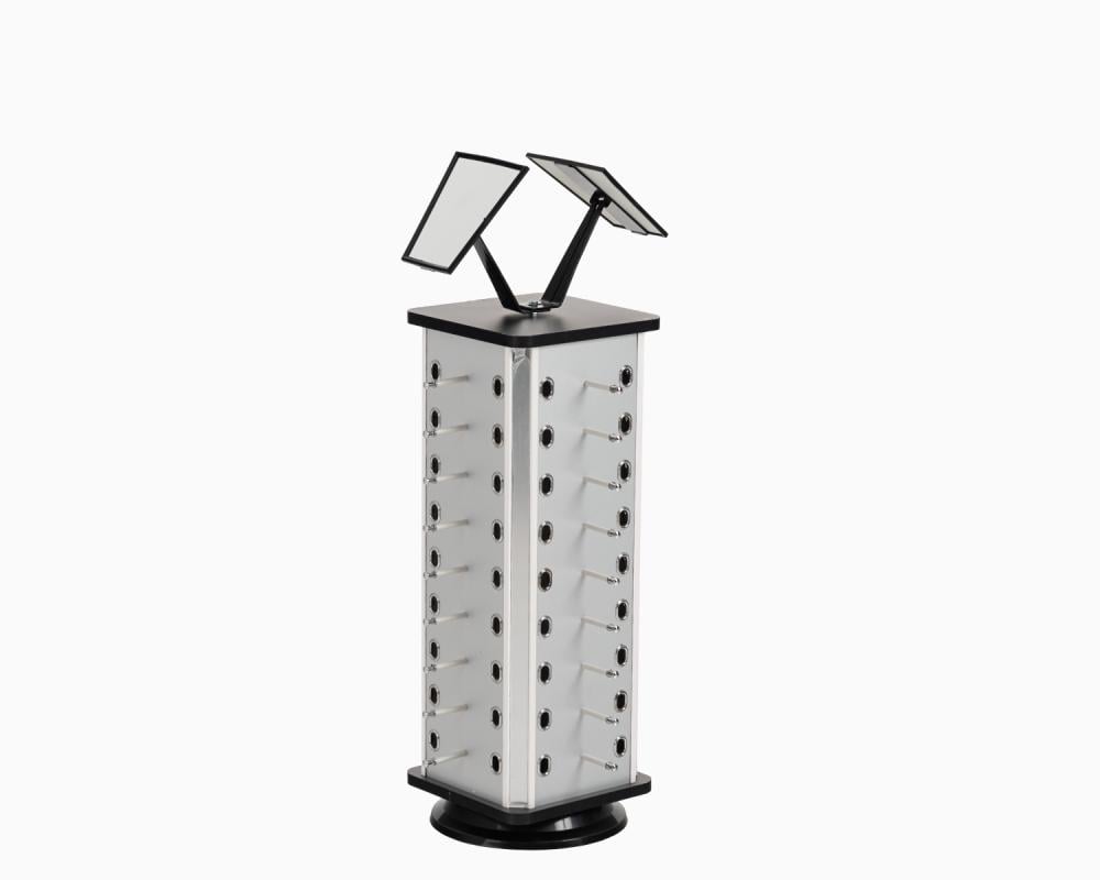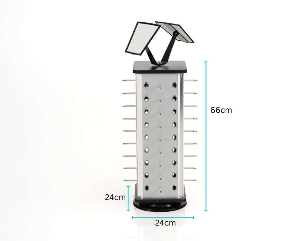 استاند عرض نظارات دوار بتصميم أنيق وعملي مزود بخطافات معدنية منظمة لعرض حتى 36 نظارة شمسية أو طبية