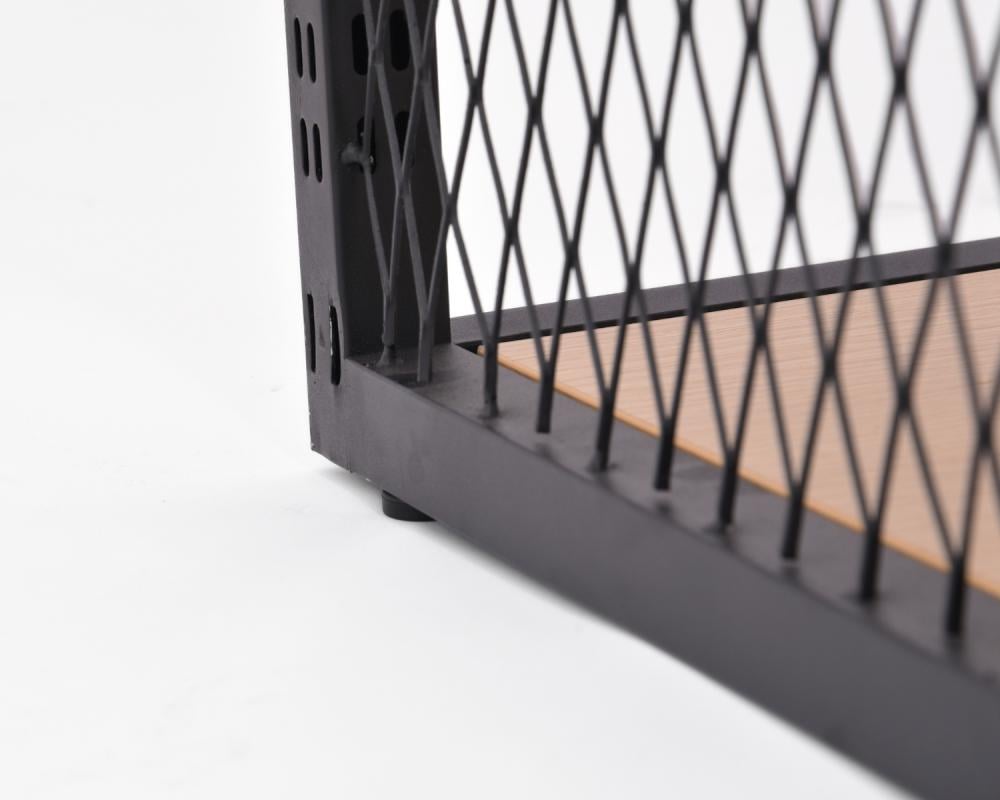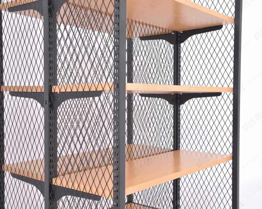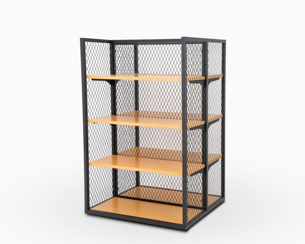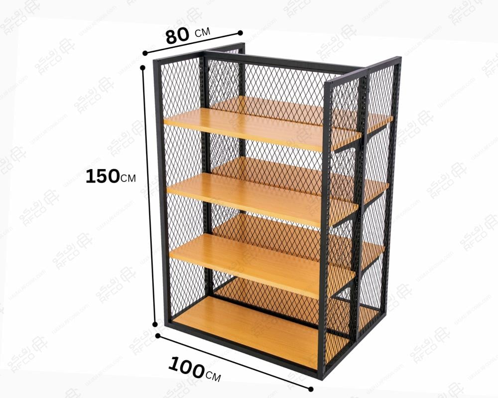 وحدة رفوف خشبية مزدوجة بإطار معدني أنيق وعصري، صممت خصيصاً لعرض المنتجات بطريقة عملية وواضحة بفضل الجوانب الشبكية التي تتيح الرؤية من جميع الاتجاهات