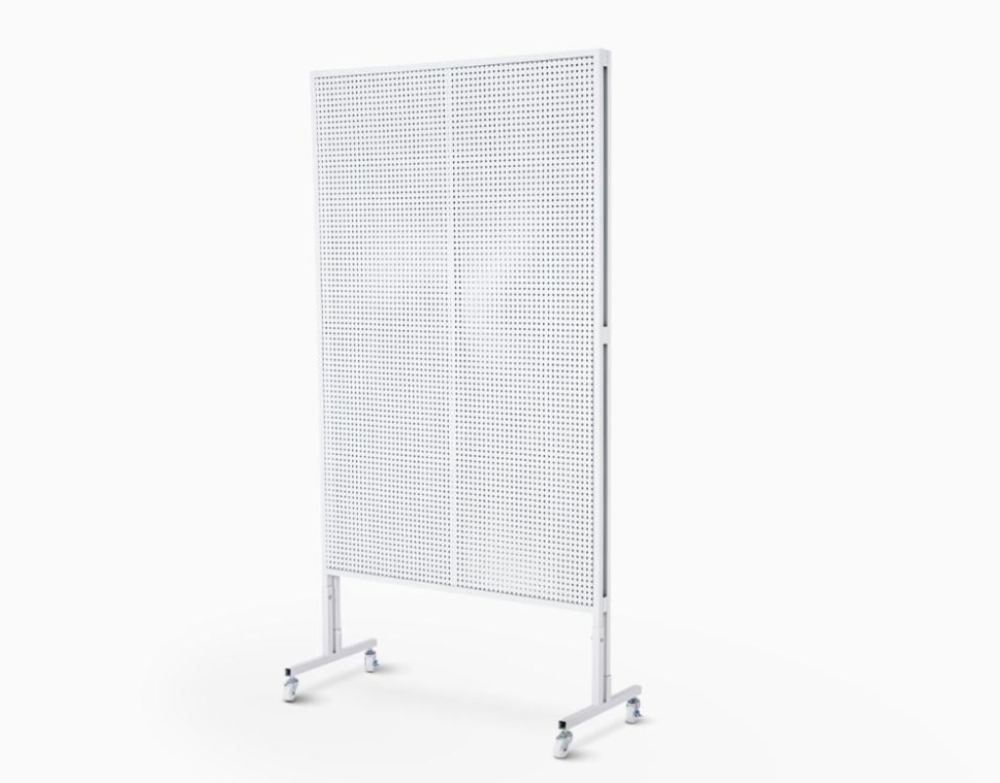 استاند صاج مخرم بخطافات على الجهتين، متحرك بكفرات مصمم لعرض المنتجات وتنظيم الأدوات بشكل عملي واحترافي